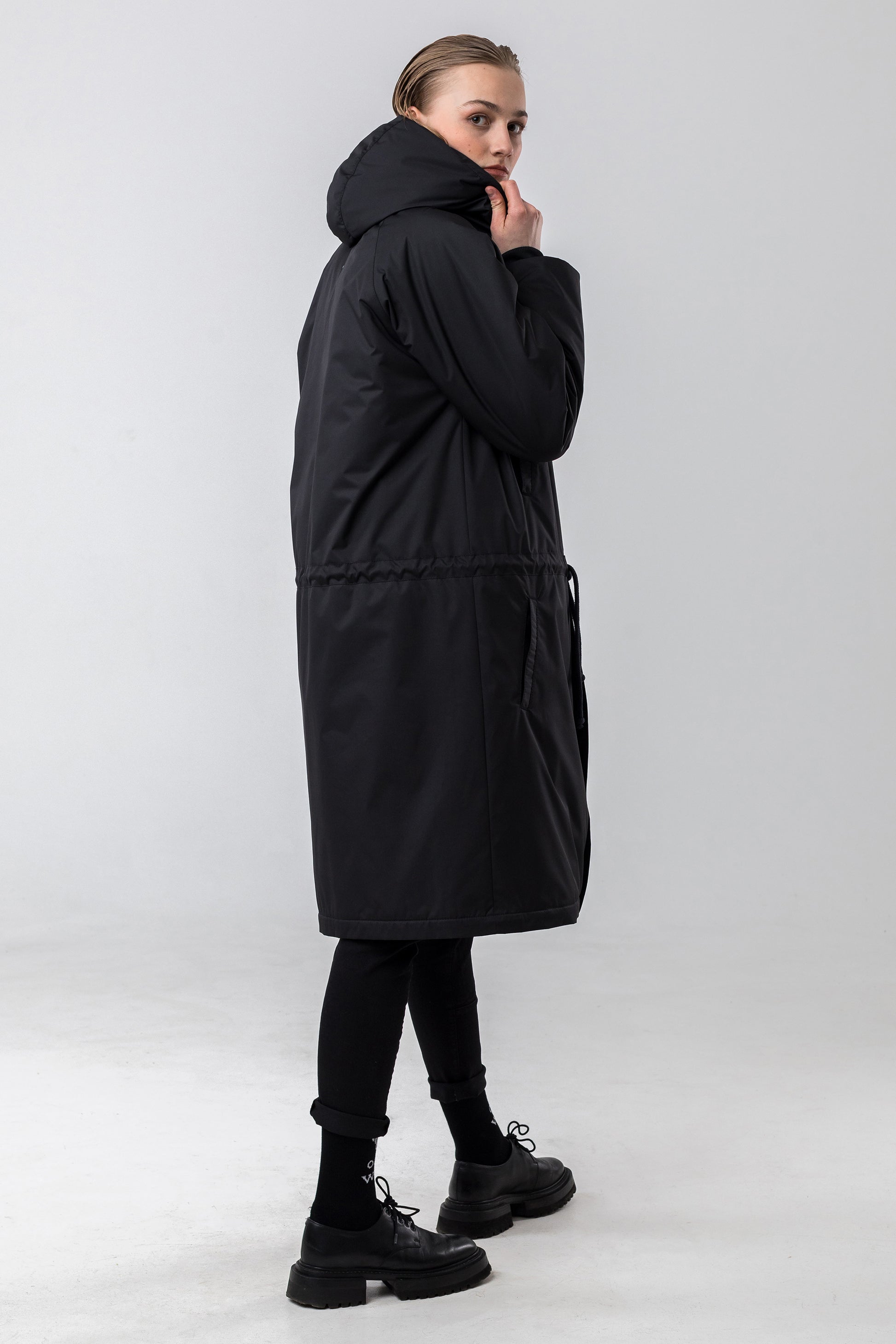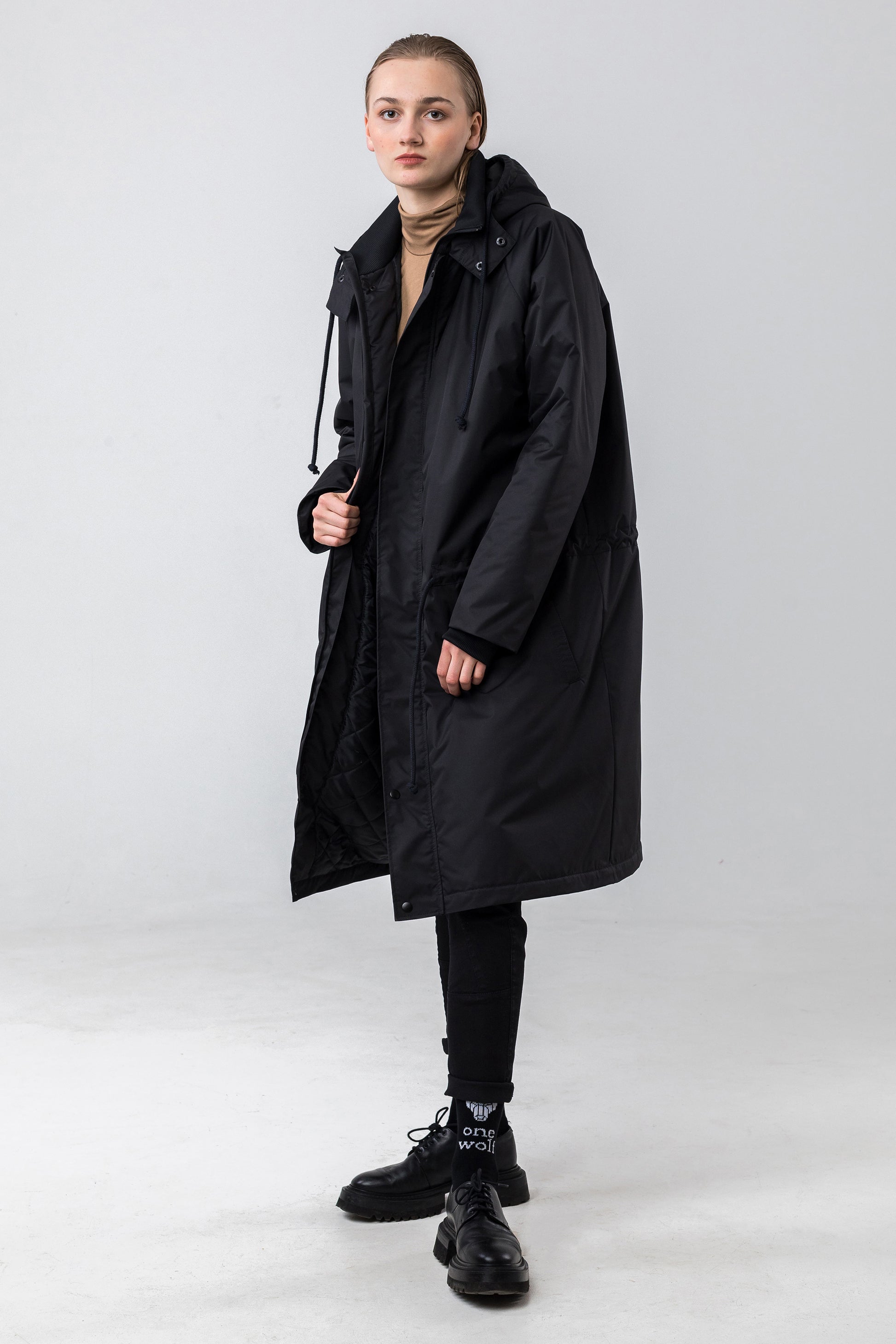 Liela izmēra unisex parka, PU pārklājums, 100% poliesters. Ar kabatām, rāvējslēdzēju un spiedpogām, lielu kapuci un regulējamu virvi jostasvietā. Krāsa: melna. Augstākā kvalitāte. Ražots Latvijā.