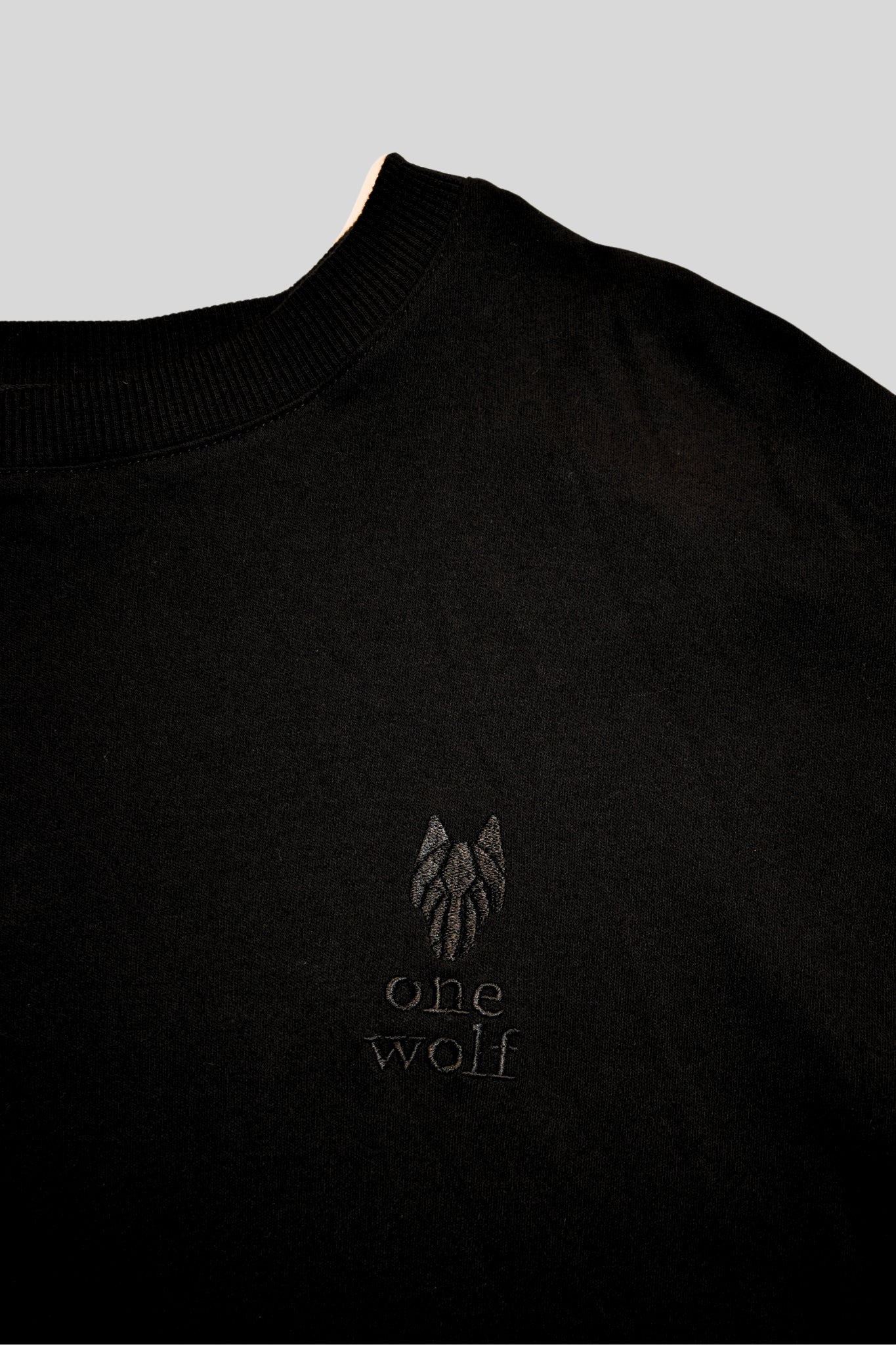 Oversize fit, black unisex T-Shirt with embroidered One Wolf logo in front.
