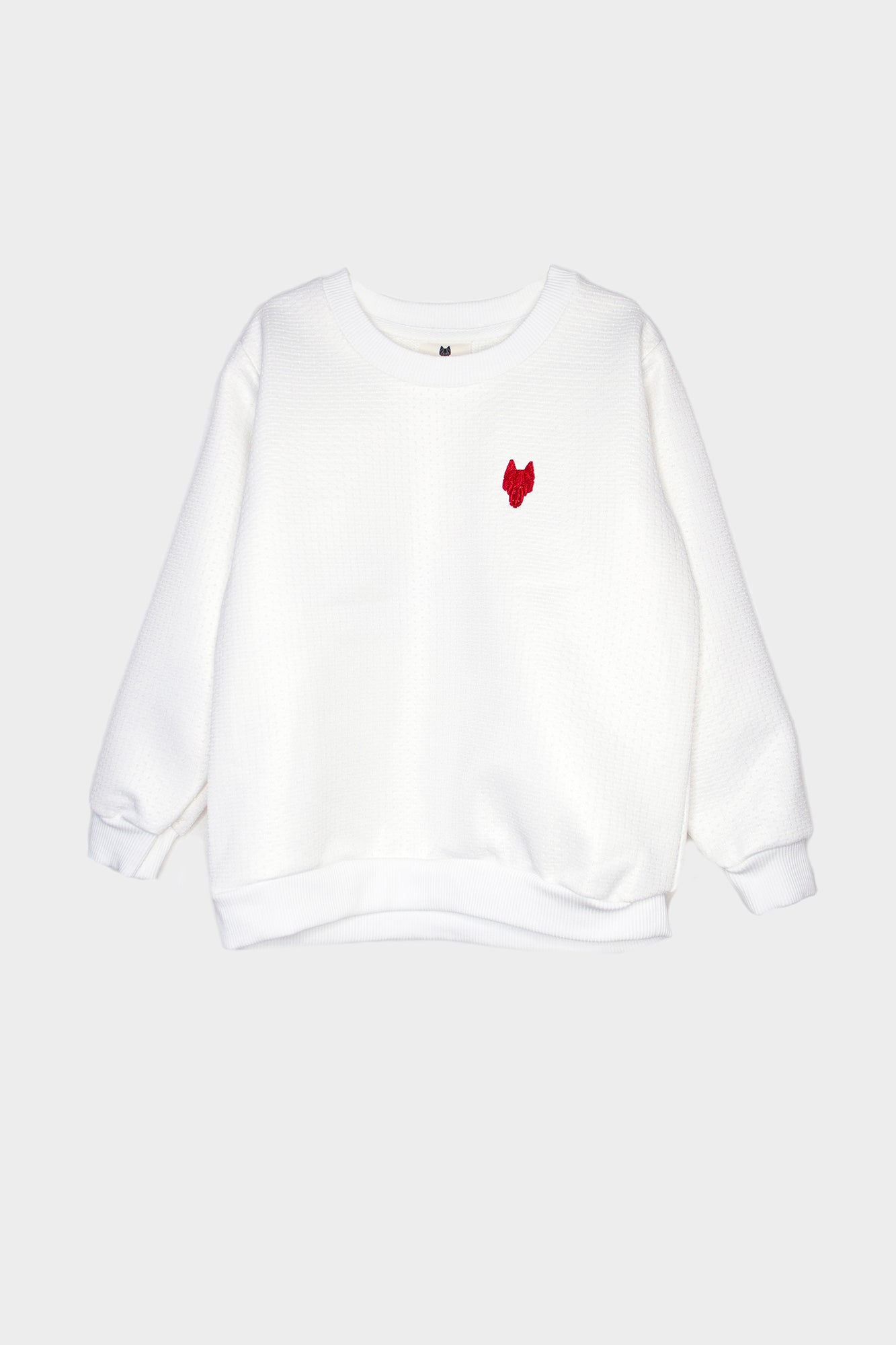 Show off your child's wild side with this stylish and comfortable white sweater, not brushed, featuring a playful red One Wolf logo embroidery. Made in Latvia for the highest quality and durability.