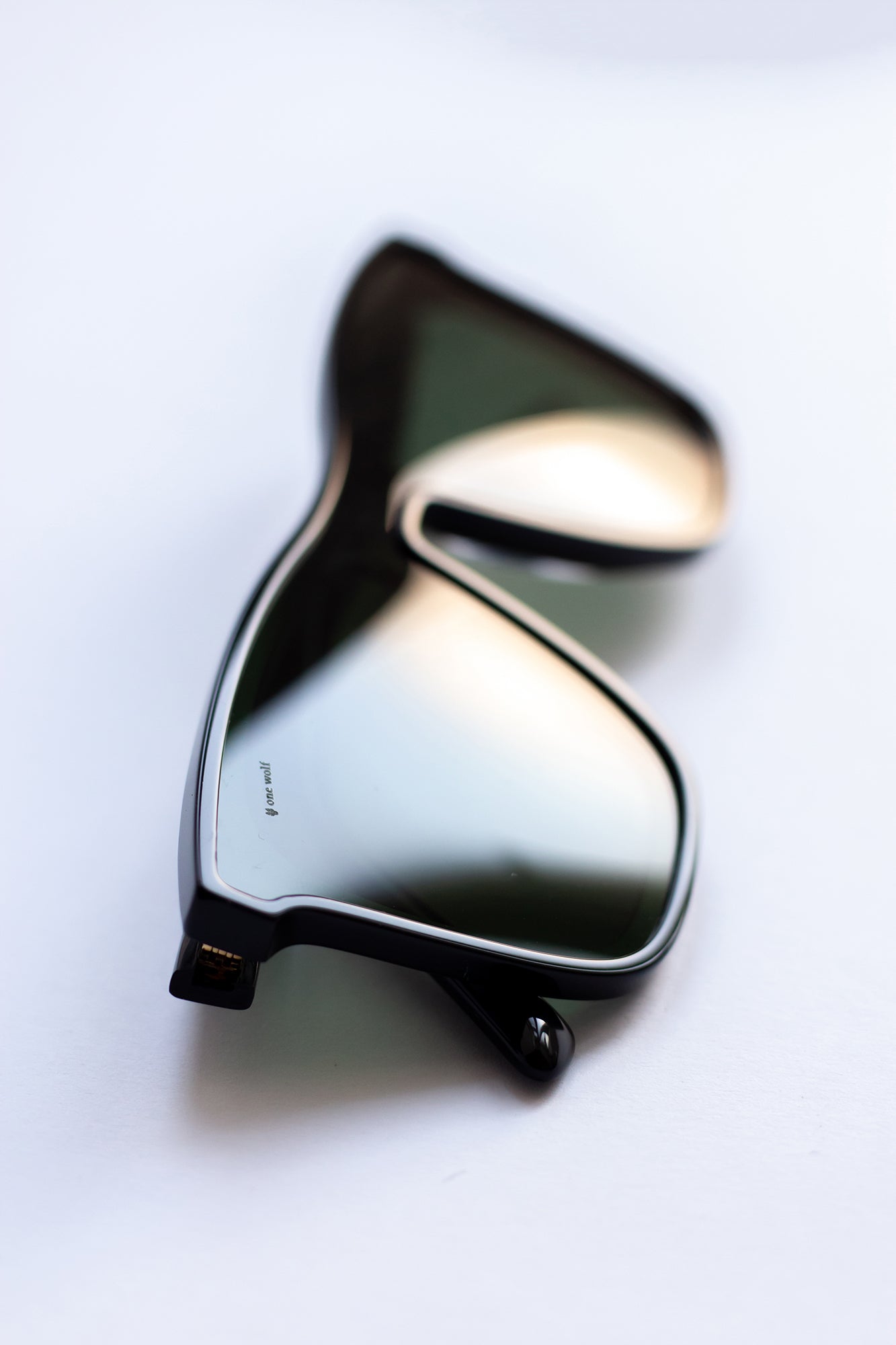 Black acetate frame, black glass, engraved "one wolf" on one of the lenses and a small engraved One Wolf's head at the temple tips.