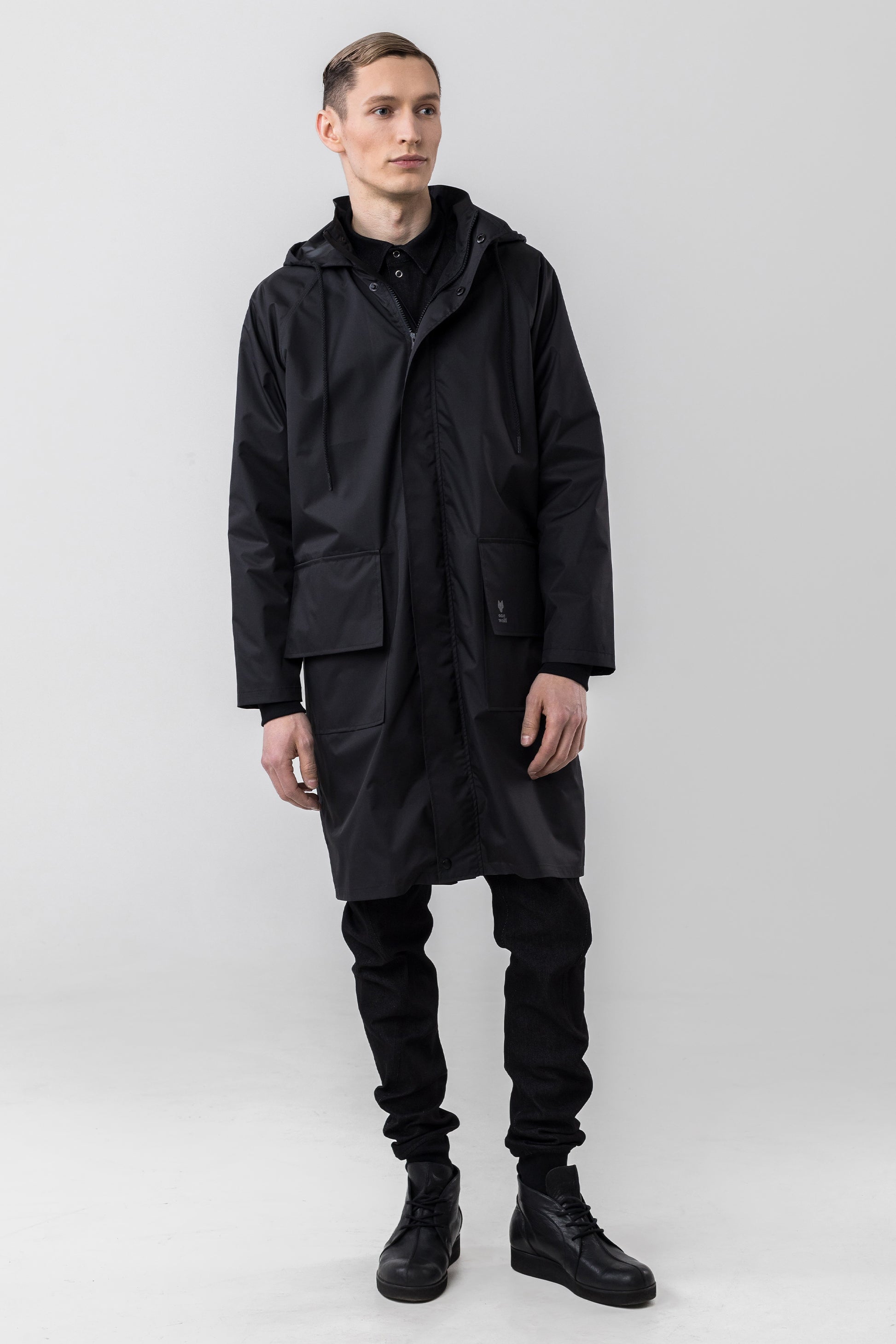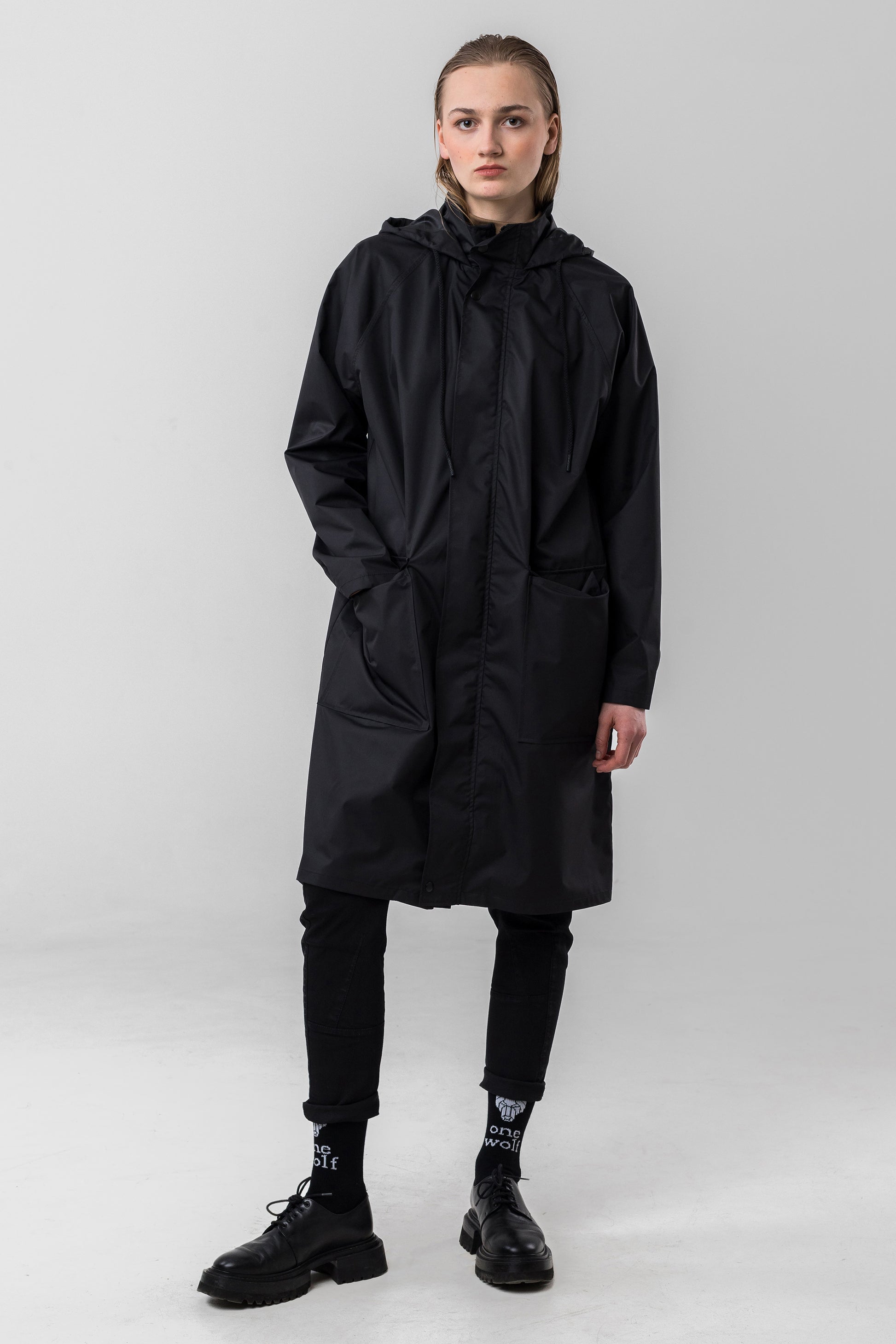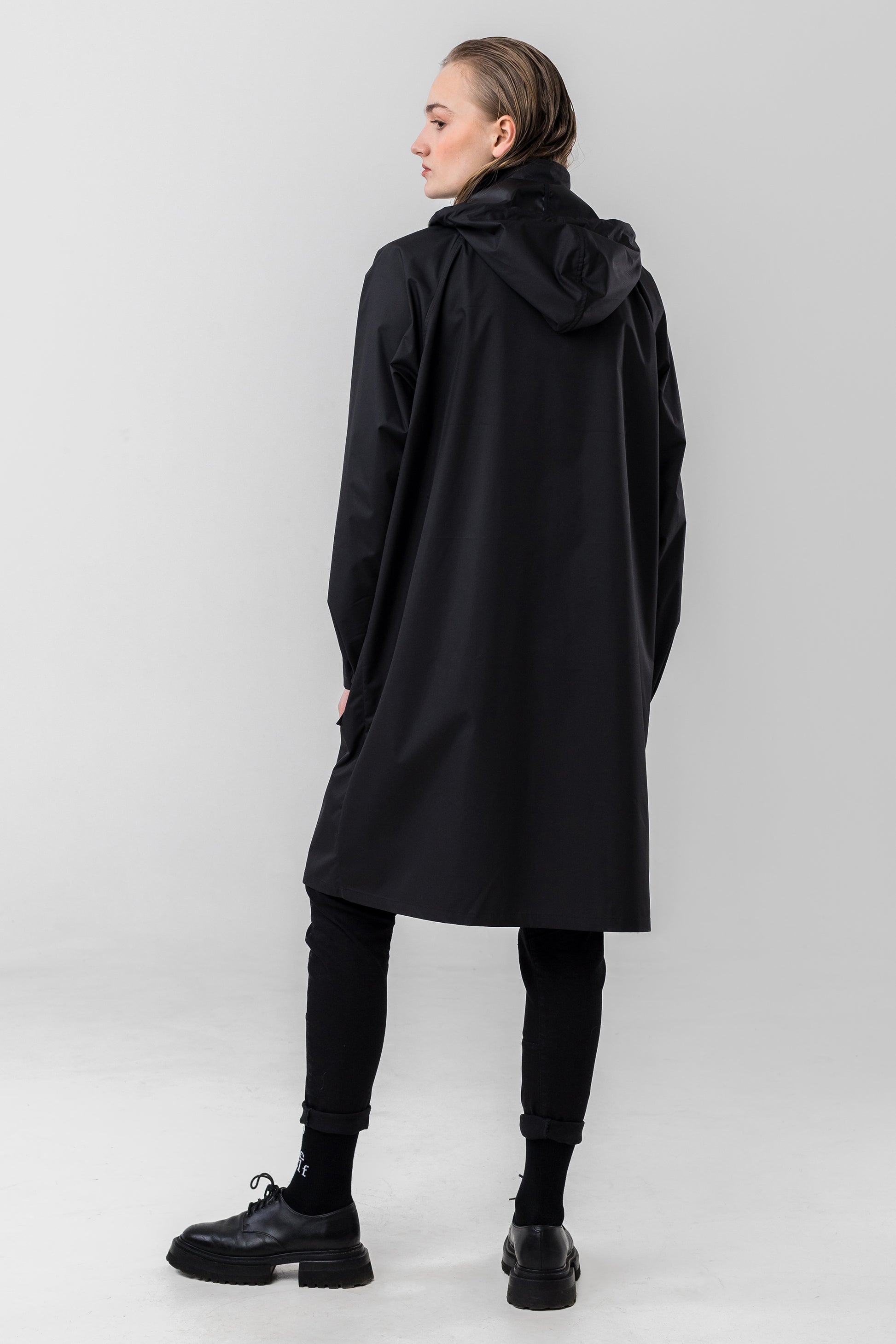 Regular fit unisex autumn raincoat. PU Coated, made from 100% Polyester. Zipper and two large pockets in front, large hood. Colour: black. Premium quality.