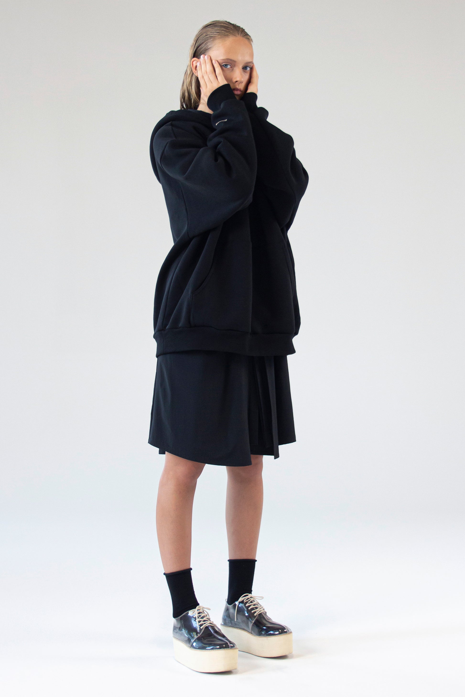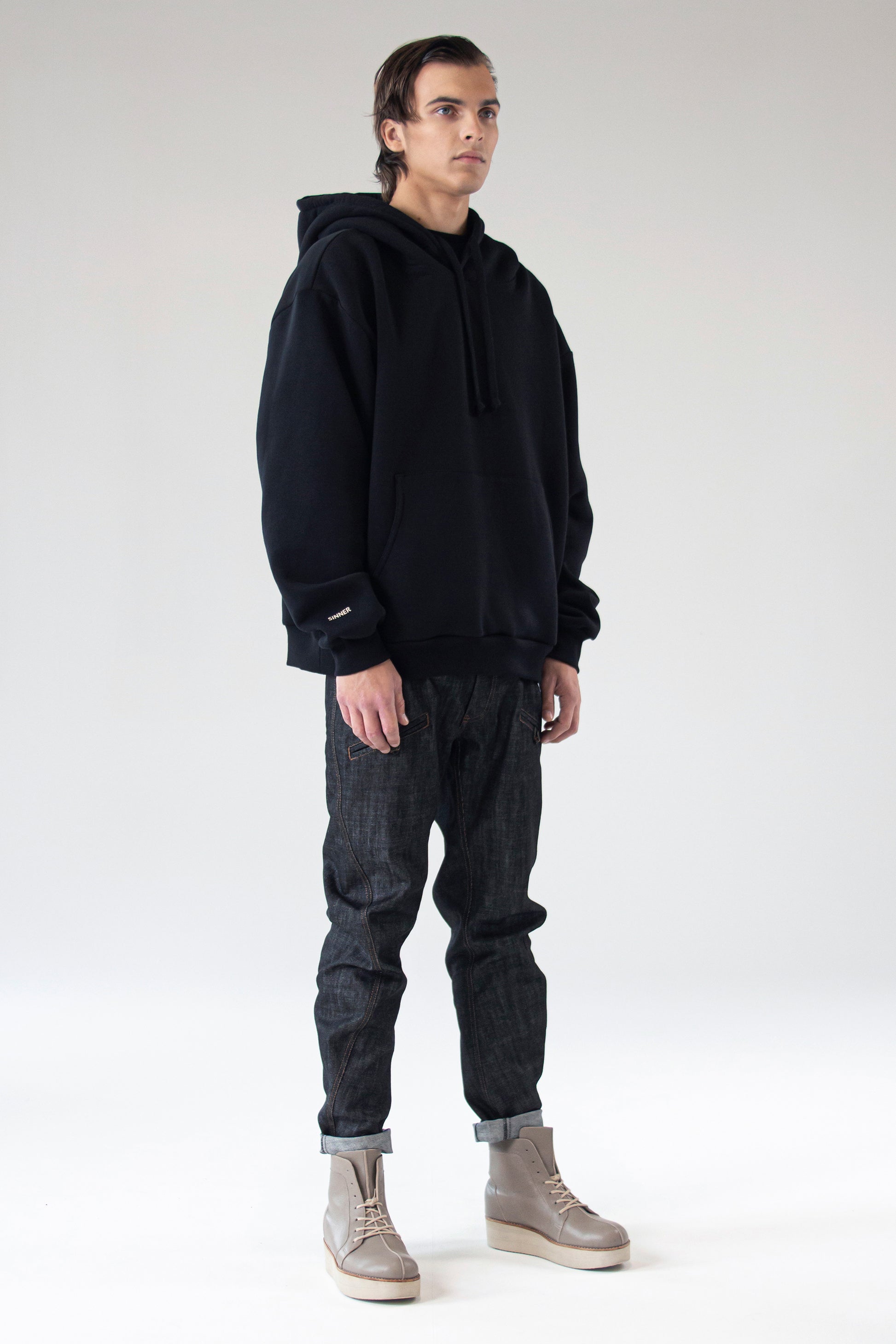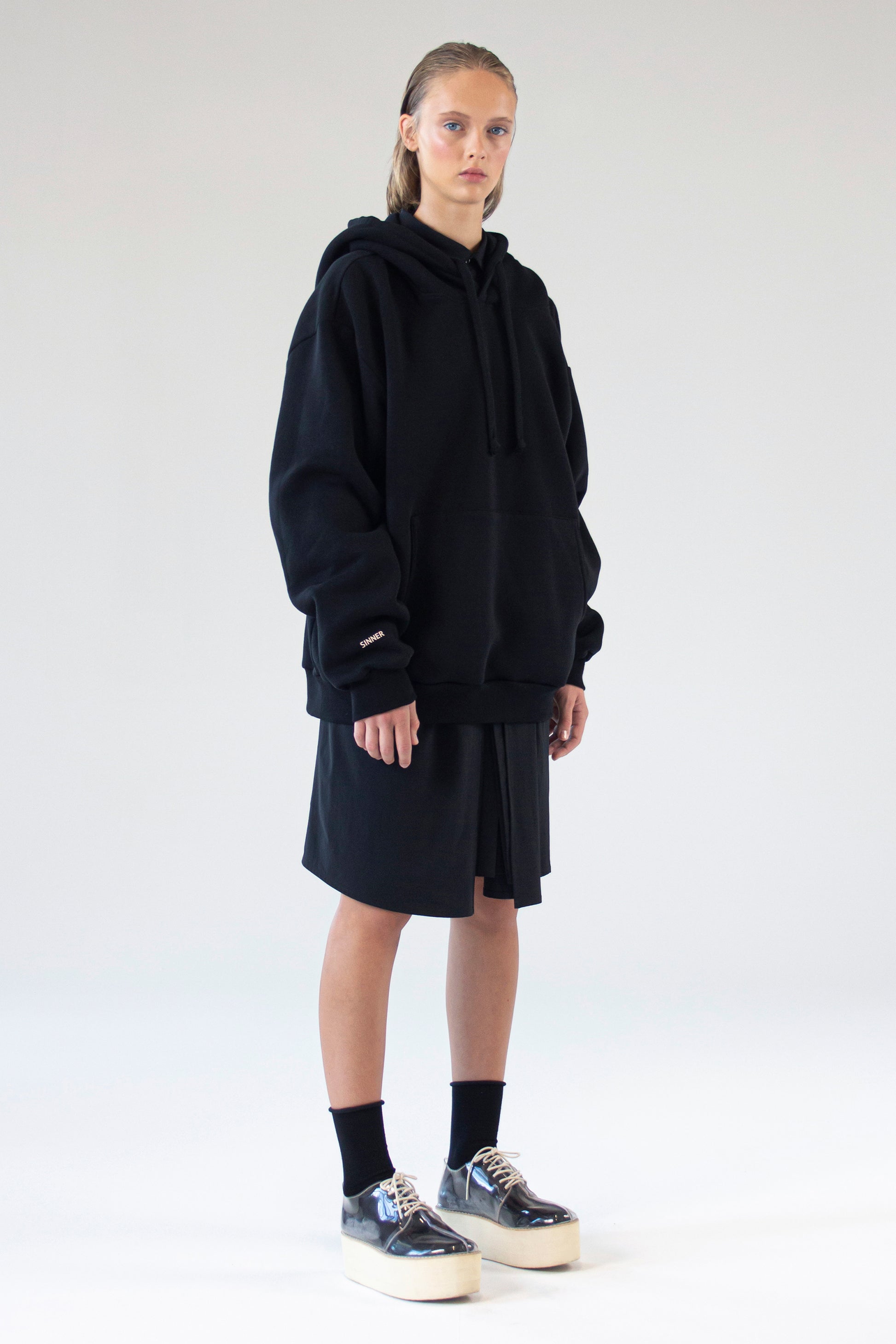 Oversized black unisex hoodie with SINNER print on the right sleeve and large handy pocket on the front of the hood. The hoodie is made of 90% cotton and 10% polyester, a certified high-quality knitted material with a soft touch inside.