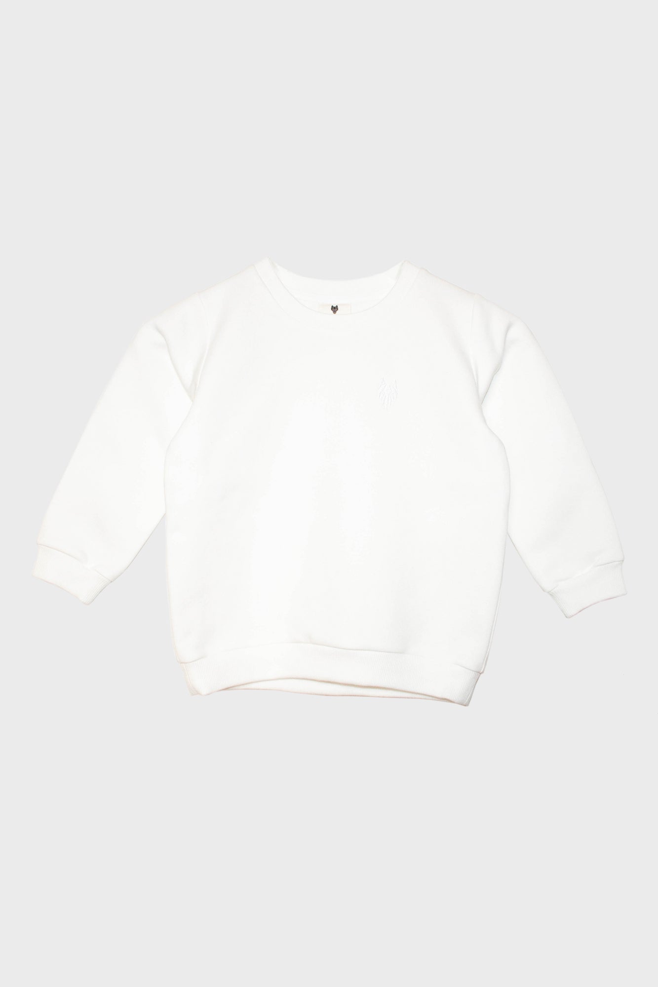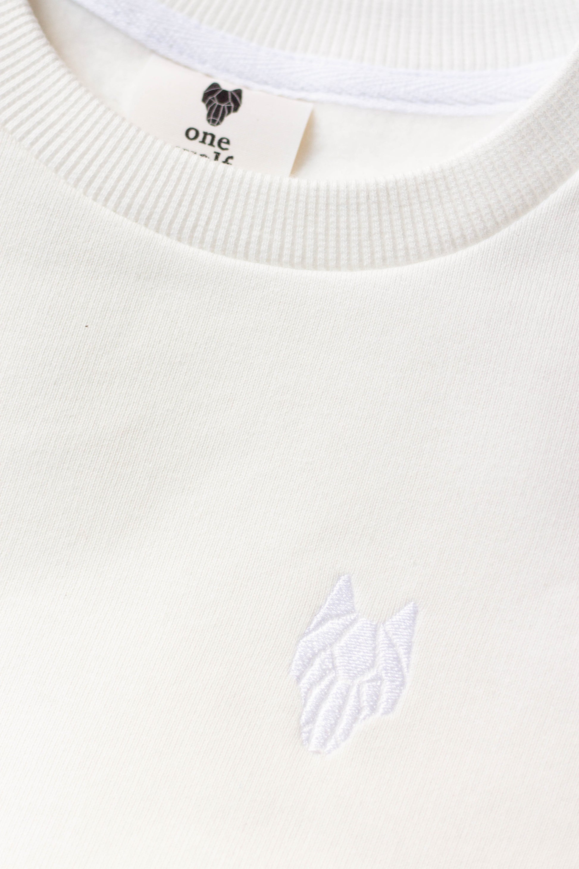Bērnu džemperis ar nelielu One Wolf logo izšuvumu uz krūtīm kreisajā pusē, baltā krāsā. Augstākās kvalitātes, 90% kokvilna, 10% poliestera, siltināta iekšpuse. Ražots Latvijā.