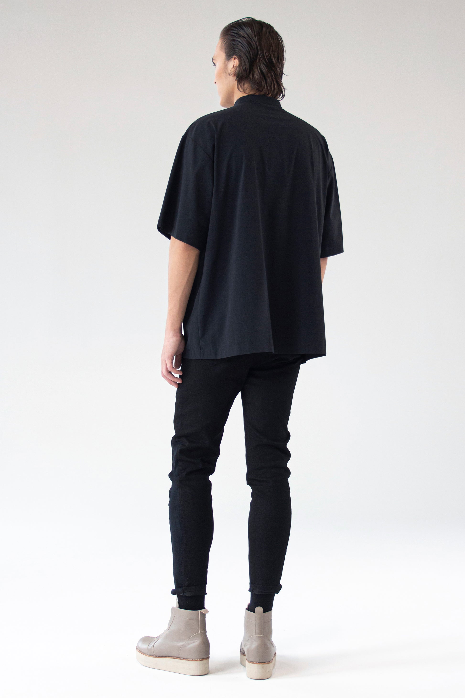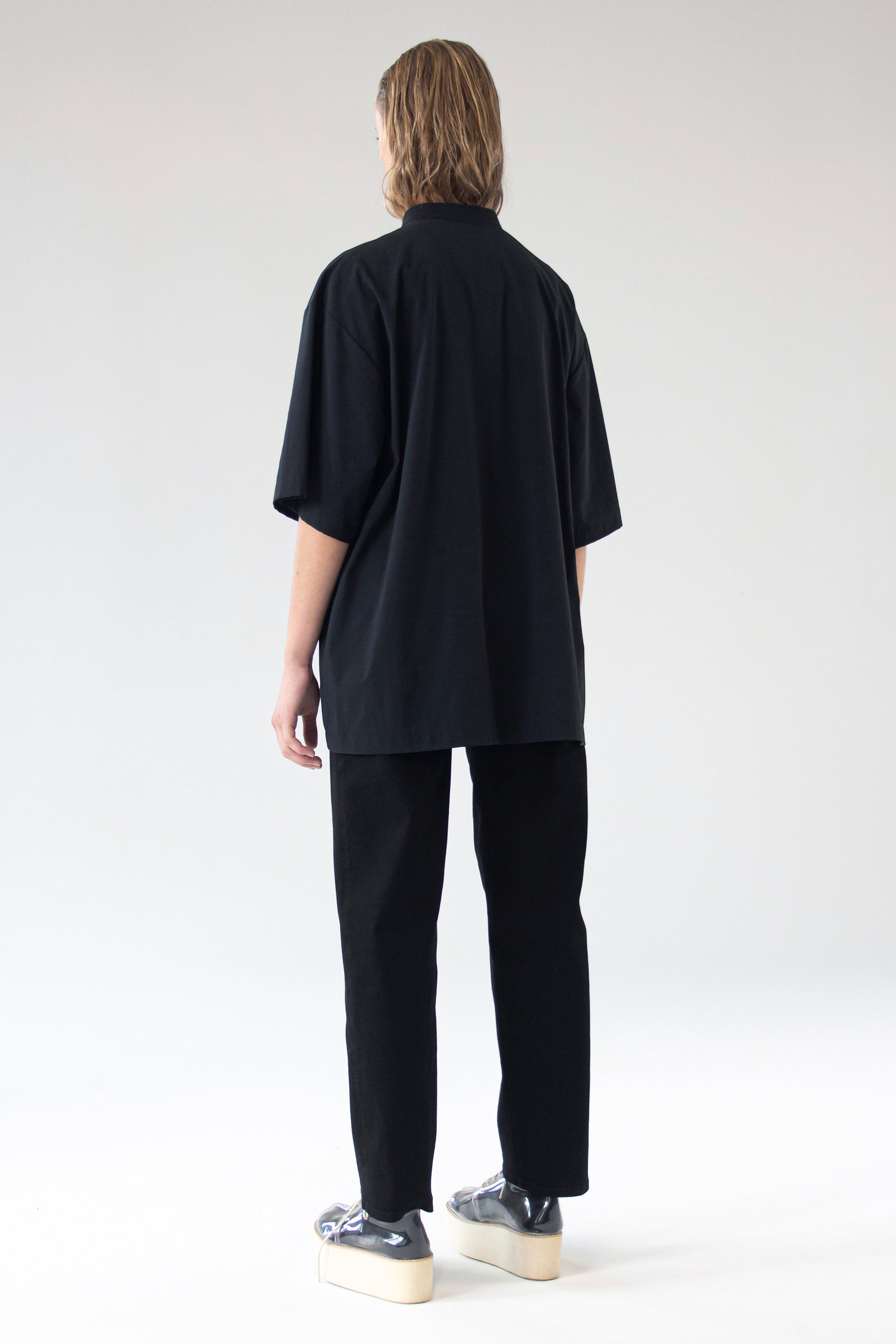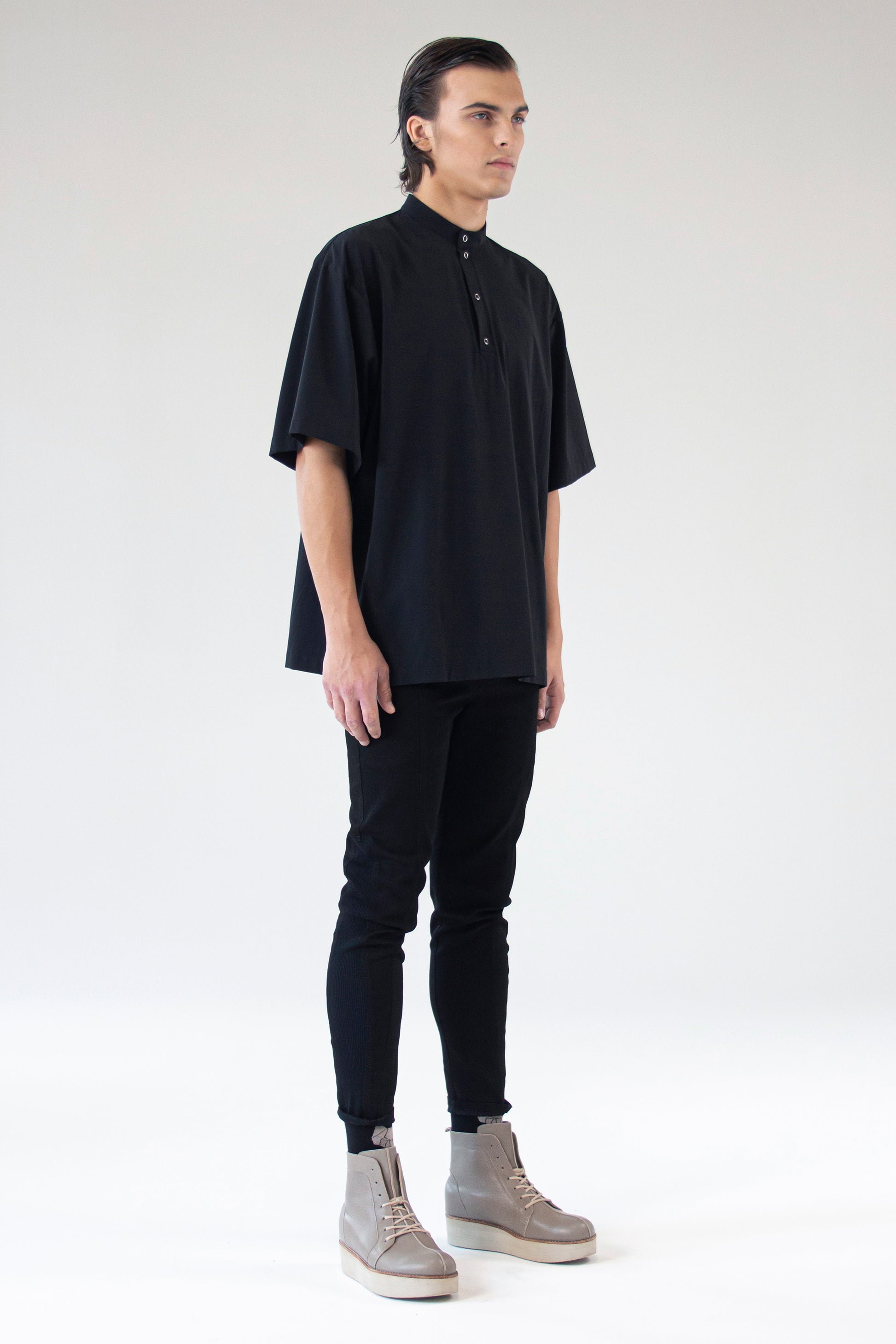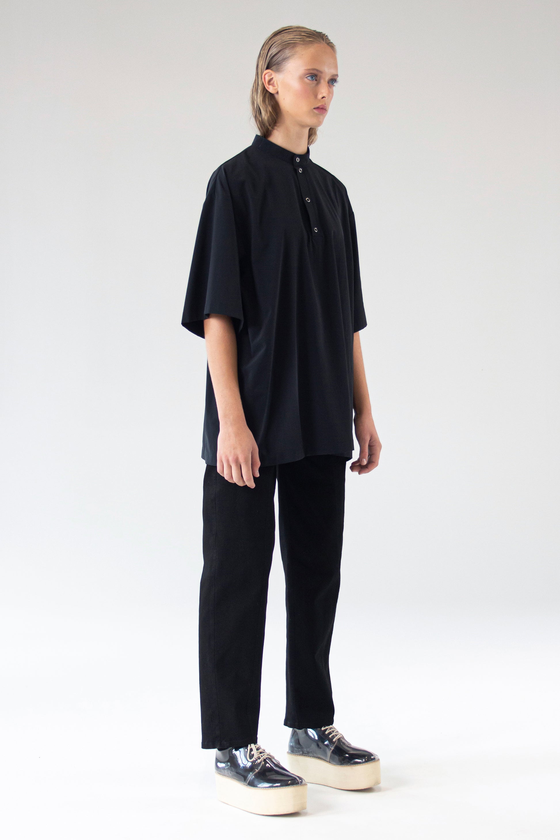 Black unisex loose-fitting shirt with short sleeves and front button fastening. The shirt has a small stand-up collar, is very light, practical and in a pleasant stretchy thin fabric. The HOLY shirt is made of high quality polyester fabric with elastane. Design and production in Latvia.
