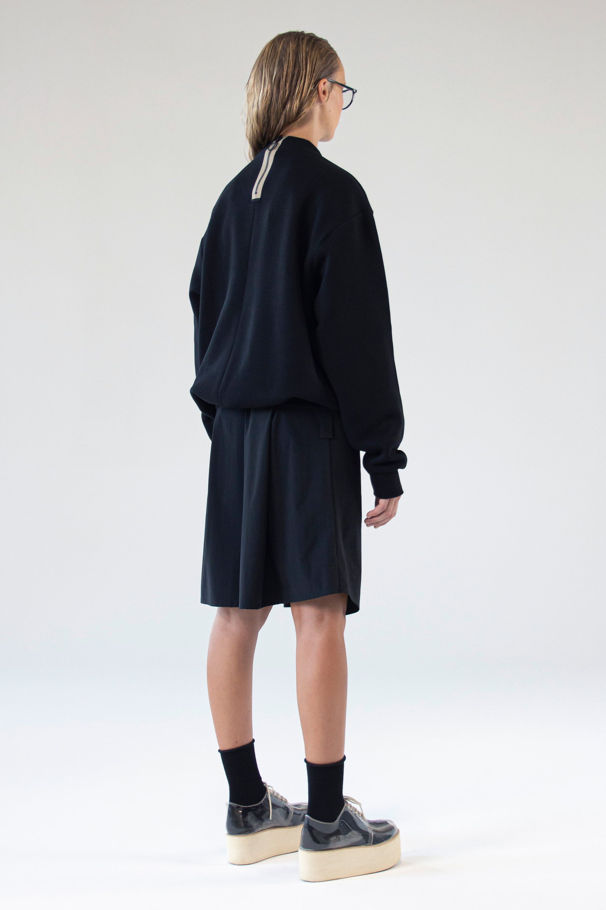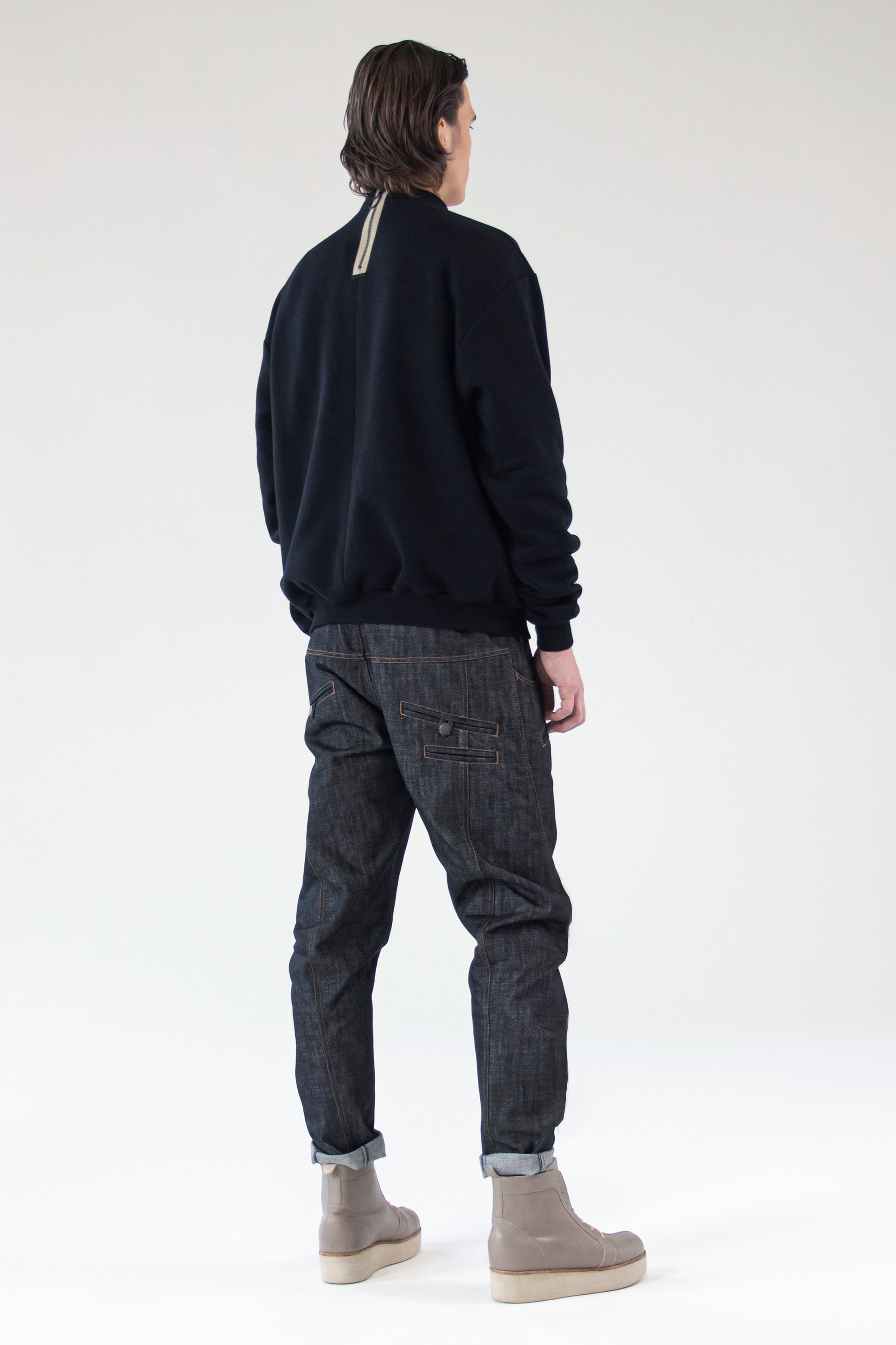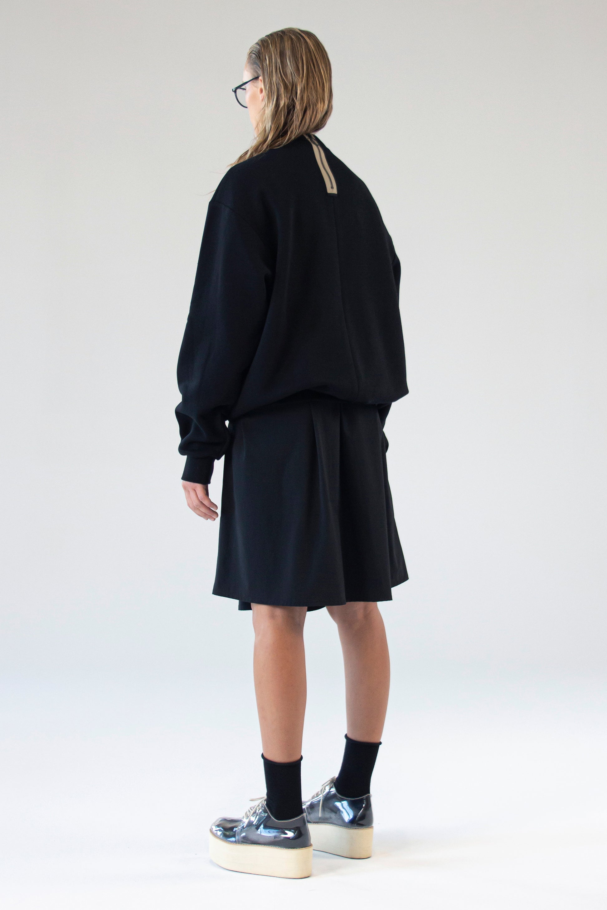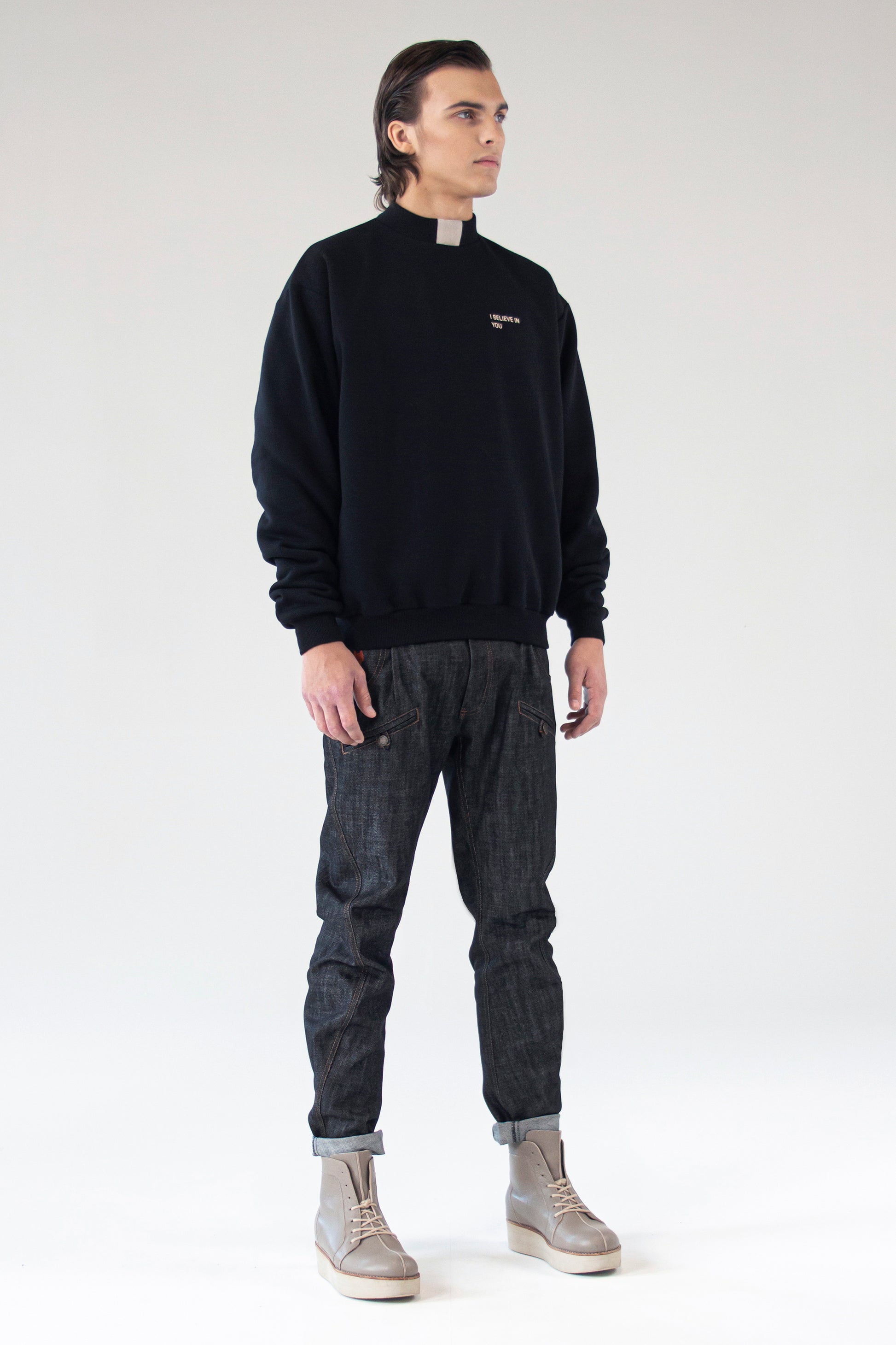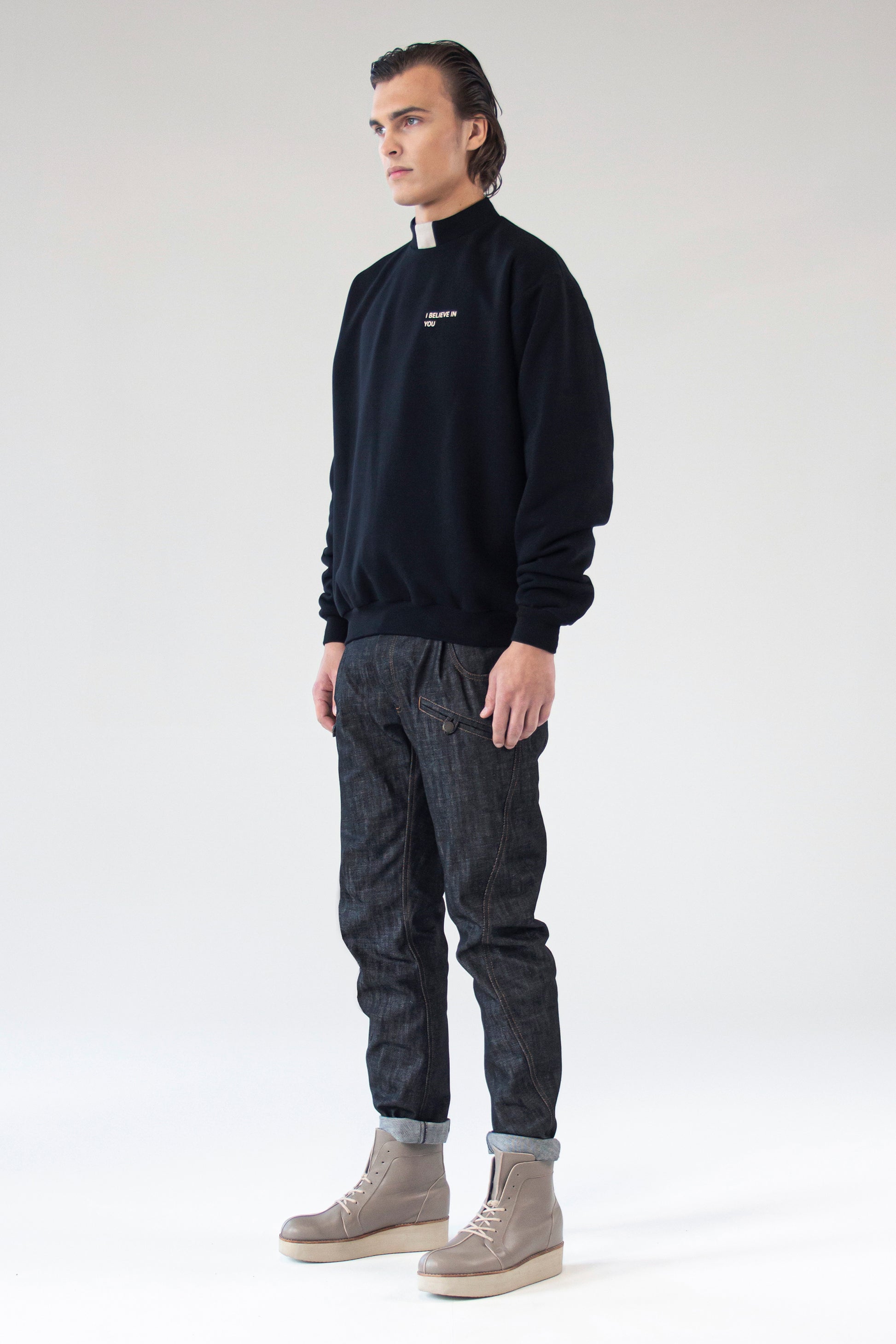 Loose fit black unisex sweater with I BELIEVE IN YOU print on the front, high collar with contrast beige detail on the front and zip at the back. The sweater is made of 90% cotton and 10% polyester - certified high quality knitted material with a soft touch on the inside. The sweater is designed and manufactured in Latvia.