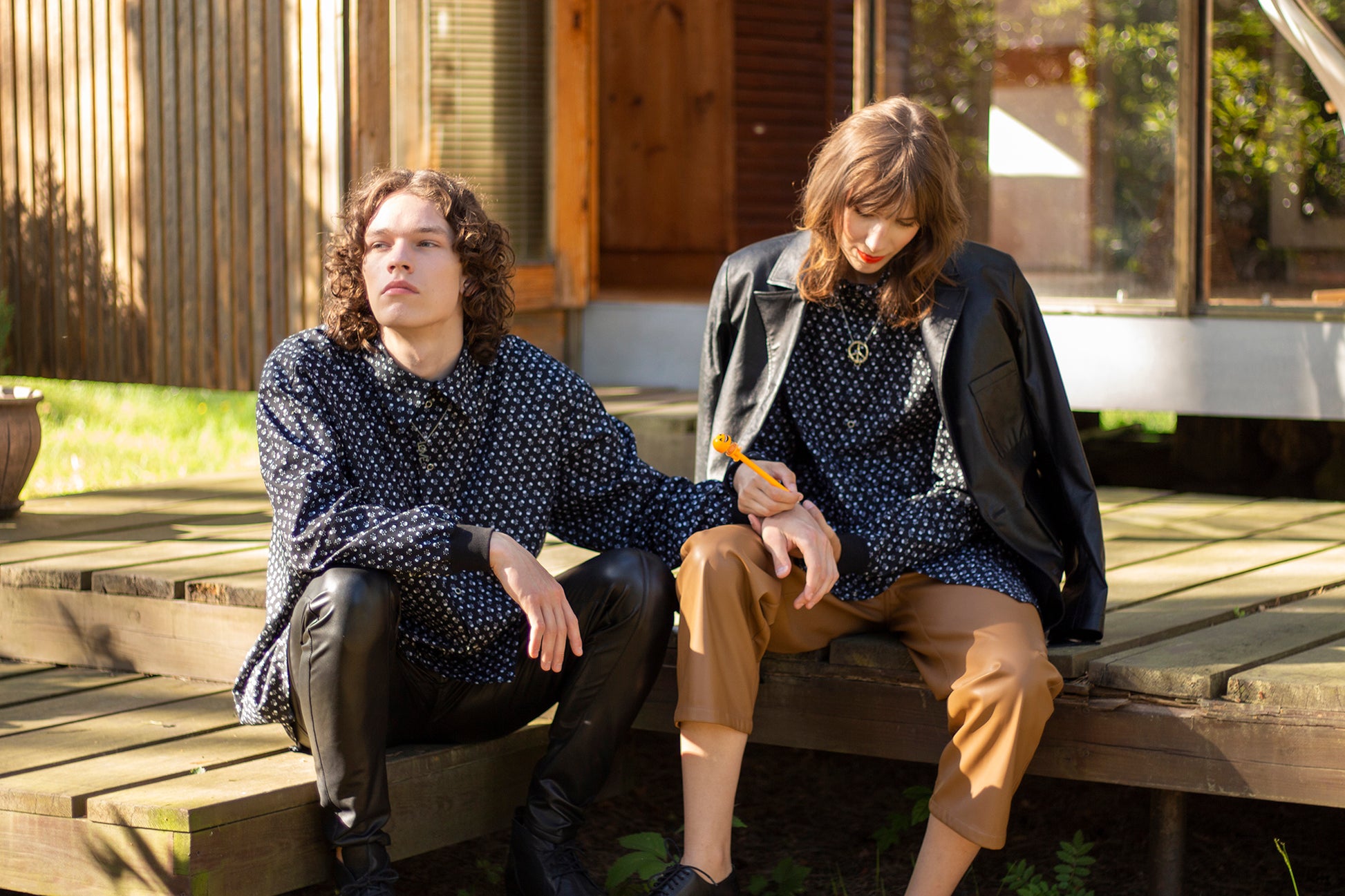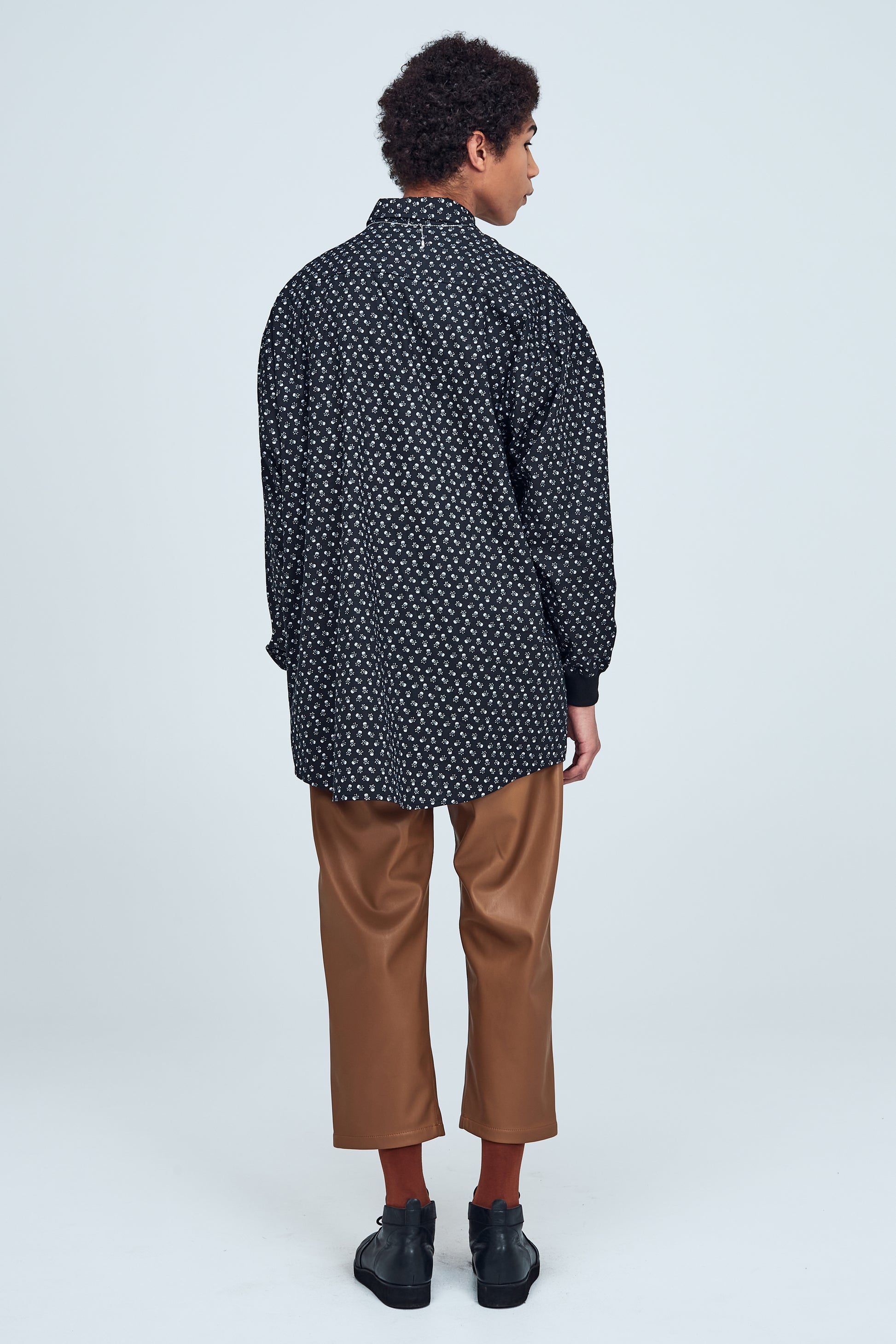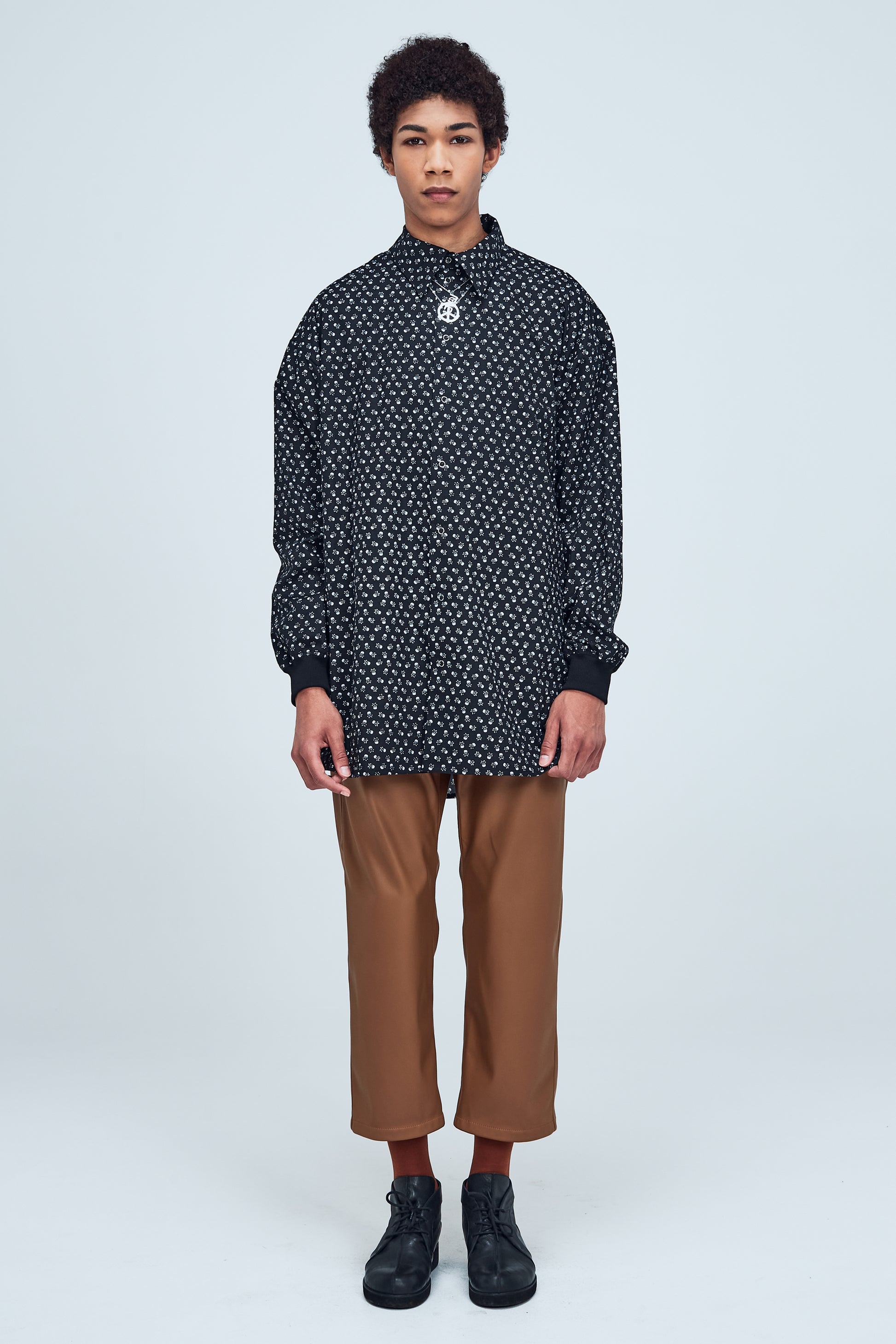 Melns, oversize unisex krekls ar spiedpogām. 100% kokvilnas audums ar mazu galvaskausu rakstu. Mīksta auduma aproces. Garas piedurknes, standarta apkakle. Ražots Latvijā. Modelis vīrietis ir 188 cm garš, valkā M izmēru. Stila foto abi valkā M izmēru, sieviete 179 cm, vīrietis 187 cm garš.