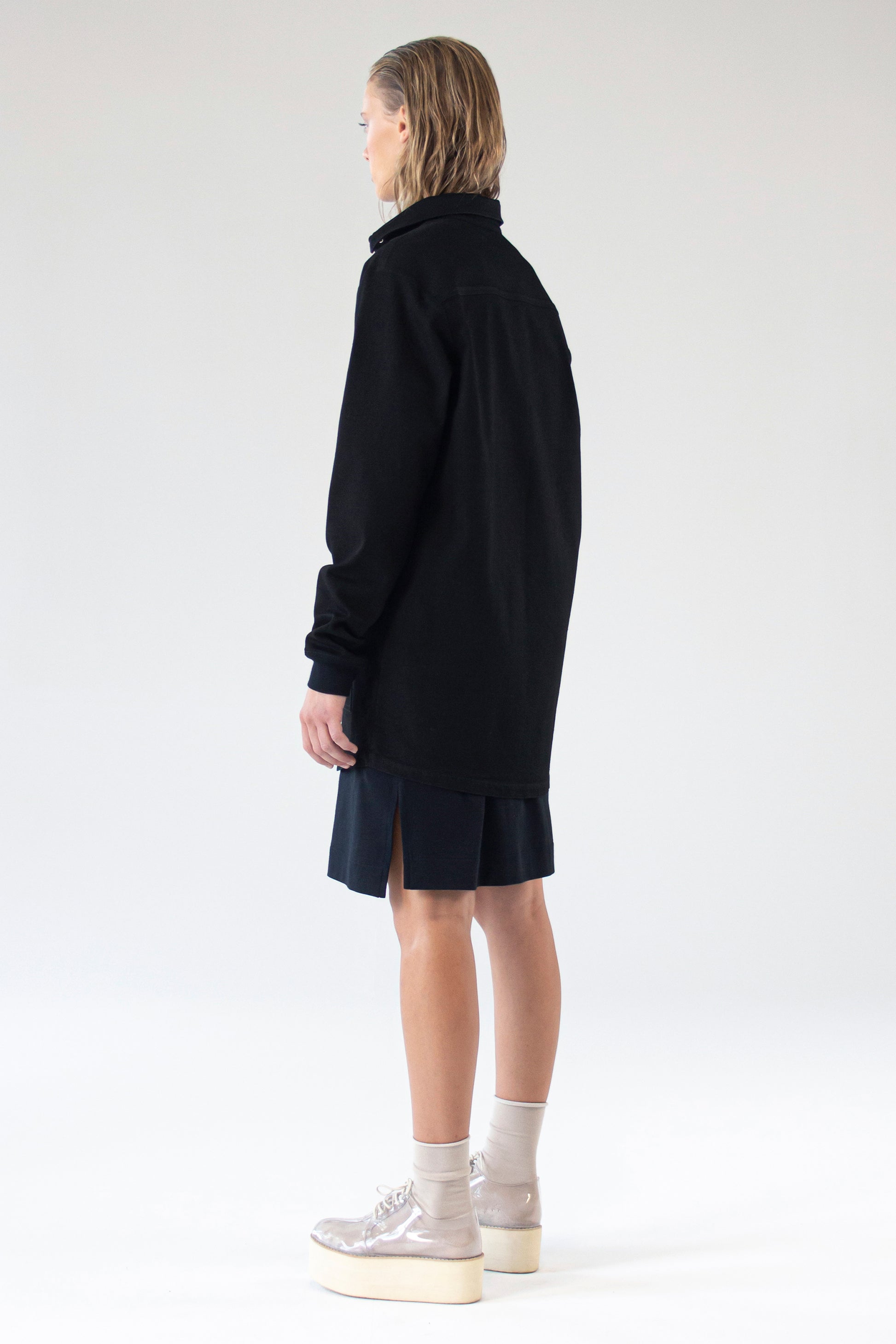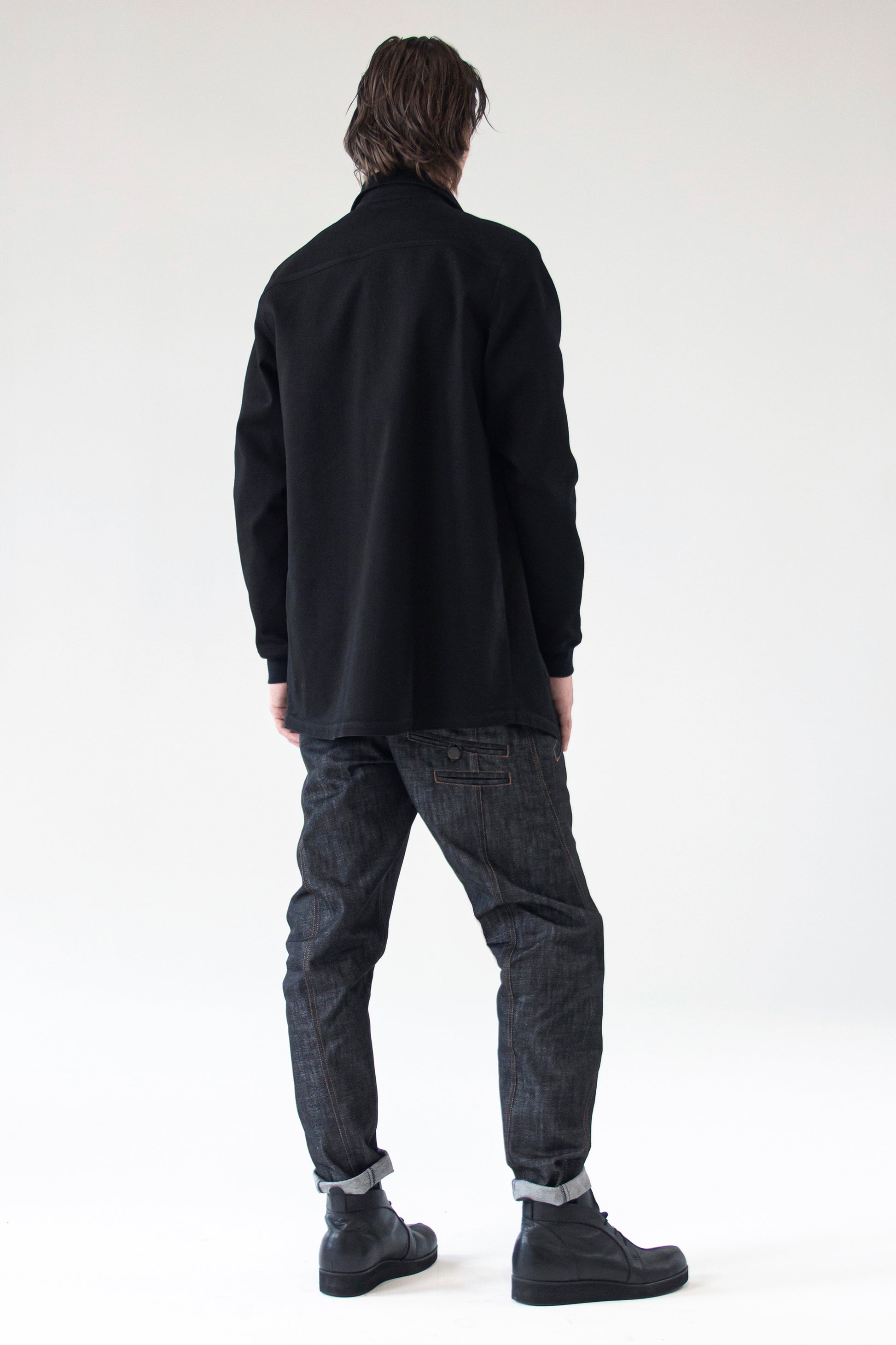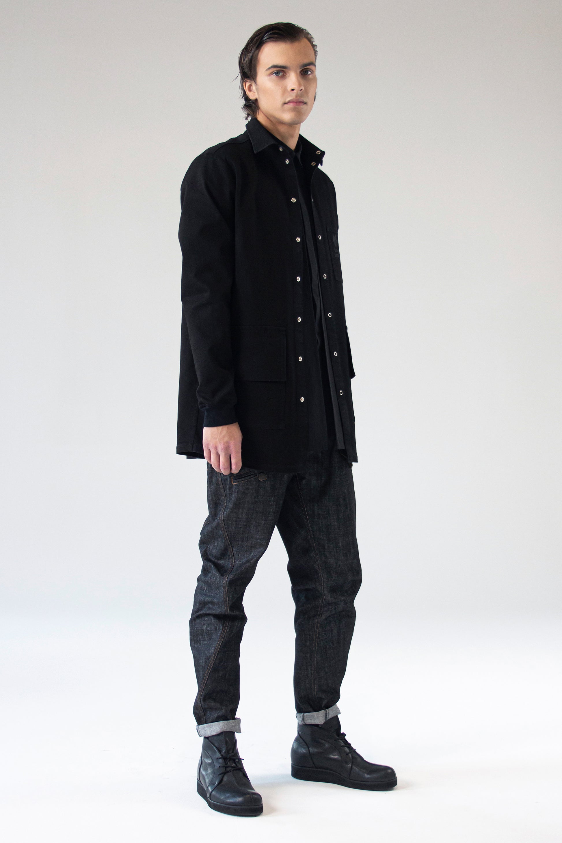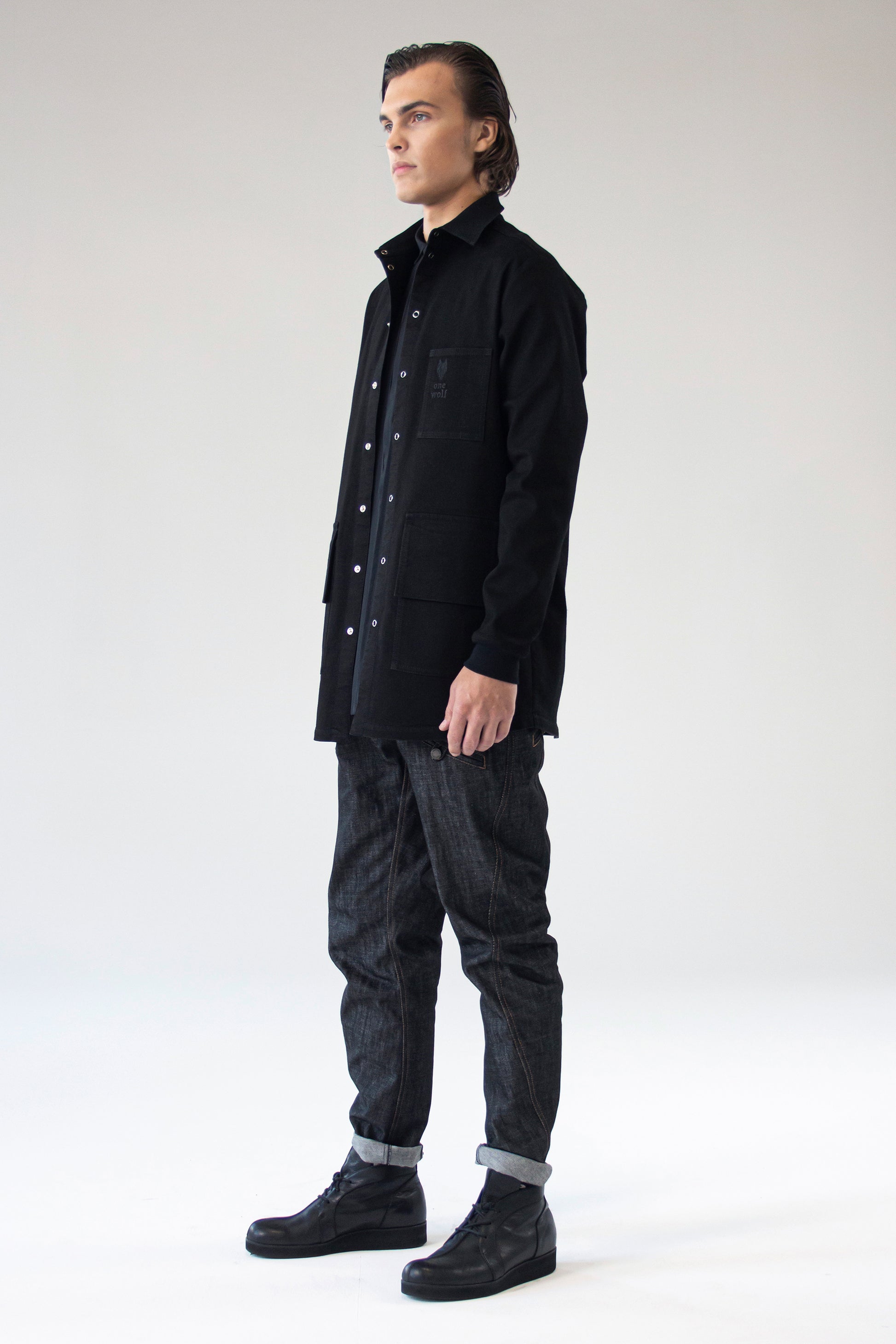 Regular fit, extended unisex denim jacket - shirt HOLY in a practical, slightly stretchy black denim fabric. The jacket has a shirt collar and a button fastening. The jacket-shirt is complemented by three practical pockets, the smallest pocket is embroidered with the One Wolf logo. The shirt jacket has a very comfortable small sped button fastening and substantial knitted RIB cuffs. The denim fabric is cotton and slightly polyester and elastane to ensure a longer lasting denim jacket and a fresher look!